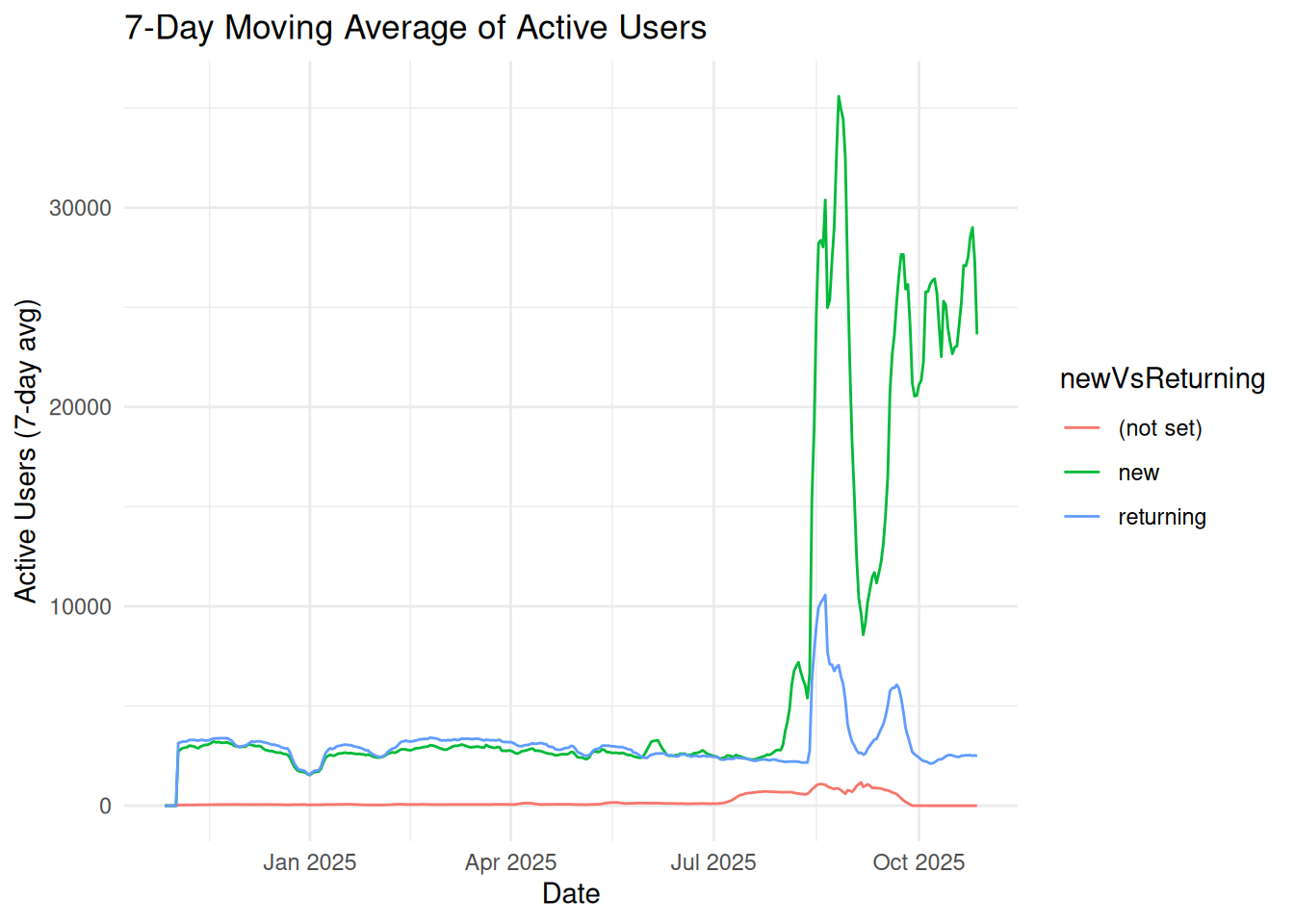 ggplot(aes(x = date, y = activeUsers_7day_avg, color = newVsReturning)) +